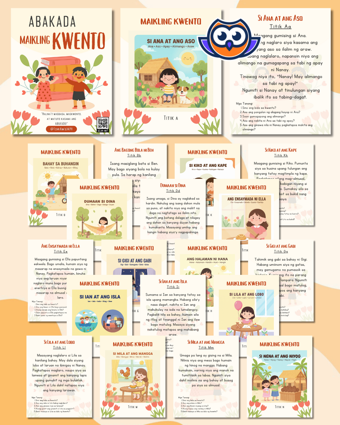 The ABAKADA Short Story Collection features fun and easy stories from Letter A to Y — each with five words, a short story, and comprehension questions to help kids learn to read and understand Filipino letters.