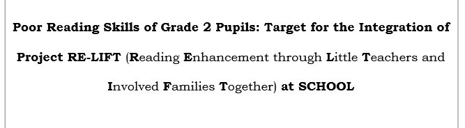 This is a ready-made action research which you can use for your reading program at school. This can be submitted for approval. Completed paper will be also uploaded if you want to complete it for BERF Funding.
