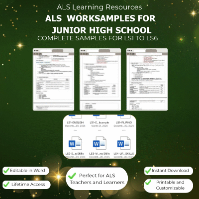 This portfolio showcases a COMPLETE SET of ALS Work Samples for Junior High School, covering Learning Strands 1 to 6 (LSI to LS6), with ANSWERS included. Designed for ALS teachers and learners who need ready-to-use, editable, and customizable resources. ✔ Editable in Word – Customize to fit your learners’ needs ✔ Lifetime Access – Download once, use forever ✔ Instant Download – Get your files immediately ✔ Printable & Customizable – Perfect for classroom or online use ✔ Includes Answer Keys for all activities