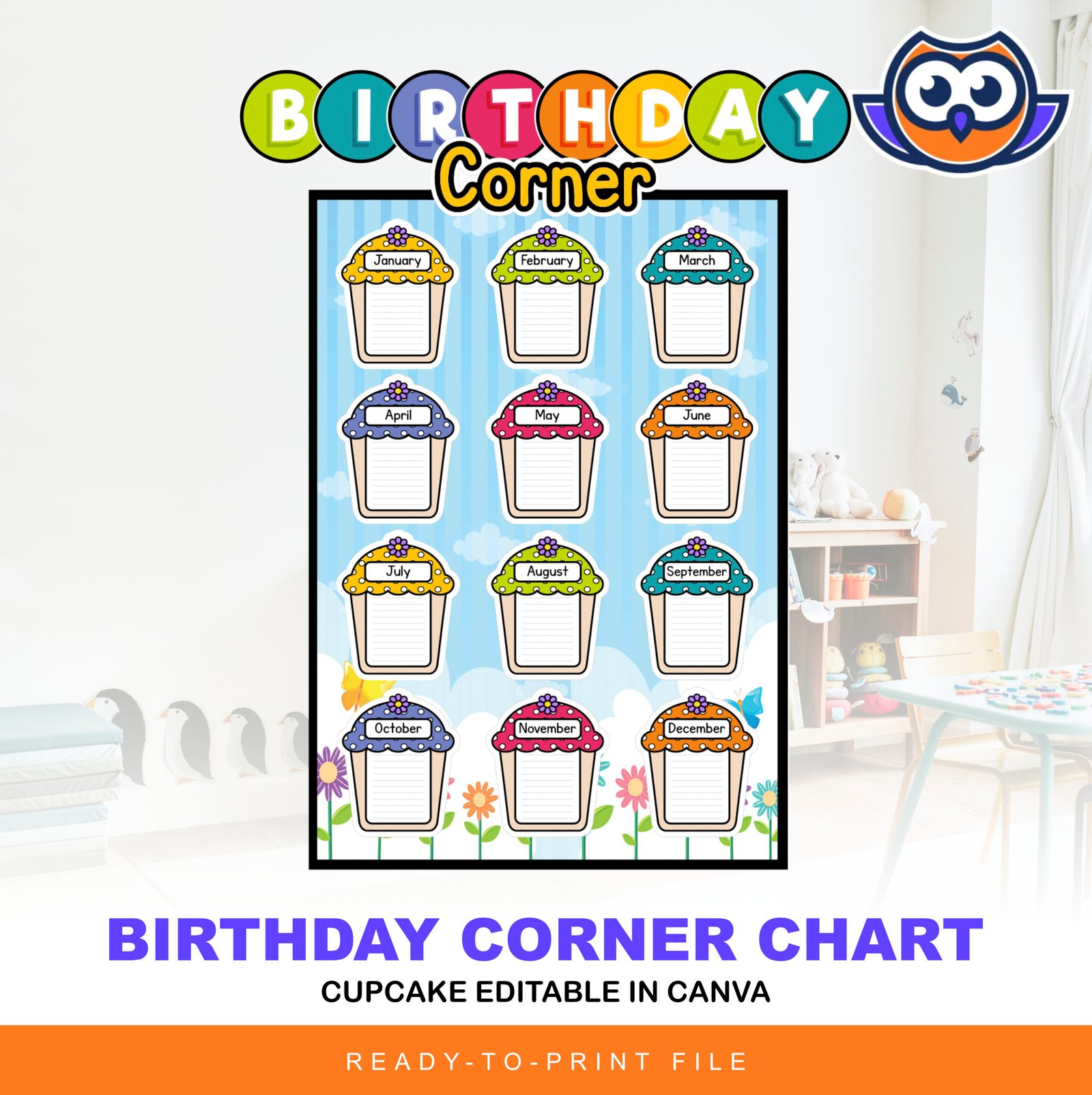 This charming and colorful birthday chart allows teachers to organize and display students’ birthdays by month using adorable cupcake cards. Each cupcake represents a month where you can add student names and birth dates—making it easy to celebrate every child’s special day!