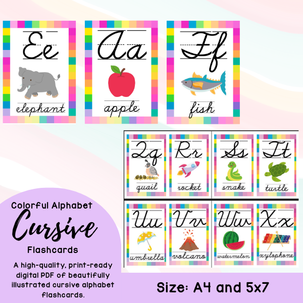 Each card features a beautifully designed letter, both uppercase and lowercase and pictures that start with the letter. These flashcards are educational and fun, making learning an enjoyable experience for your little one. Ideal for home or classroom use