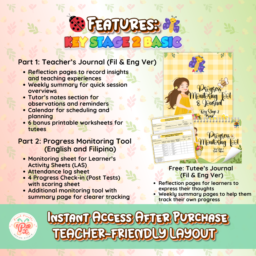 Keep your tutoring sessions organized and track your learners’ growth with this Customized ARAL Program Progress Monitoring Tool and Tutor’s Journal designed for Key Stage 2 Basic. This editable and printable tool helps teachers and tutors document learners’ progress, monitor skills per activity, and reflect on daily sessions — all in one convenient file. Perfect for ARAL tutors who want a structured yet personalized way to track improvement and ensure learner success!