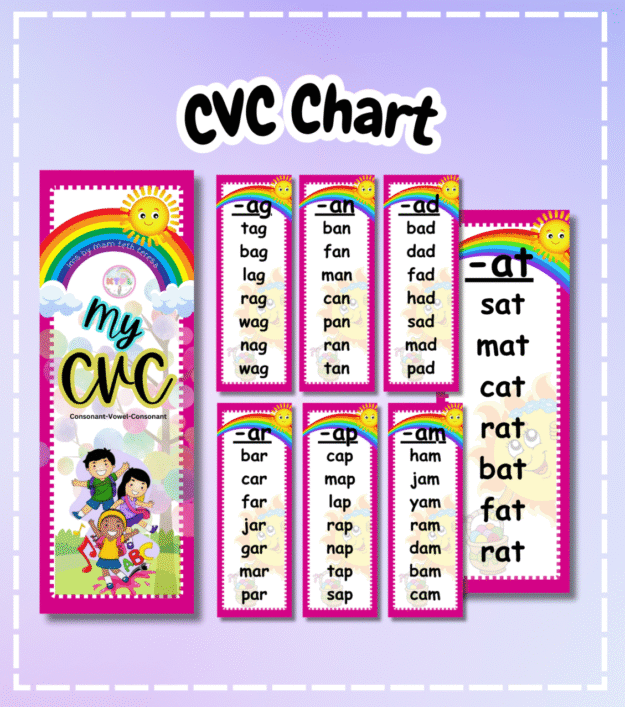 Using a CVC chart in kindergarten helps young learners take their first steps in reading. With this words children learn to sound out each letter and blend them together. As they read the chart, their eyes light up with joy and pride—realizing they can read on their own. It’s a simple yet powerful way to build their confidence and love for reading, one small word at a time.