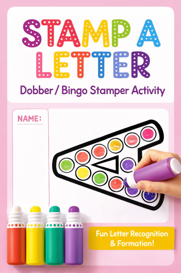 This activity helps children recognize and form letters by stamping inside circle guides using a dobber or bingo stamper. It develops letter familiarity, hand control, and creativity while making learning fun and interactive.