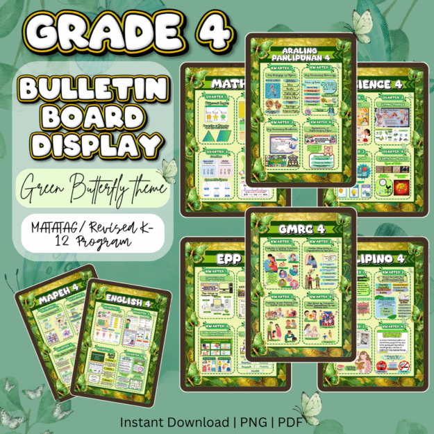 Designed with a green butterfly theme, the display creatively features content and highlights from 1st to 4th Quarter on a single page layout, perfect for summarizing the whole school year at a glance.