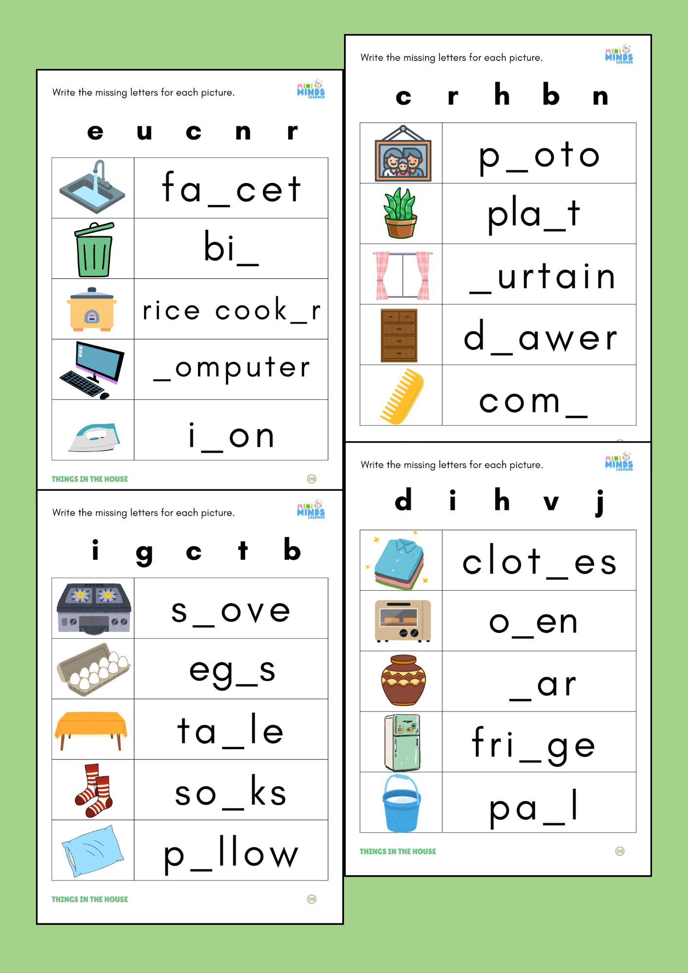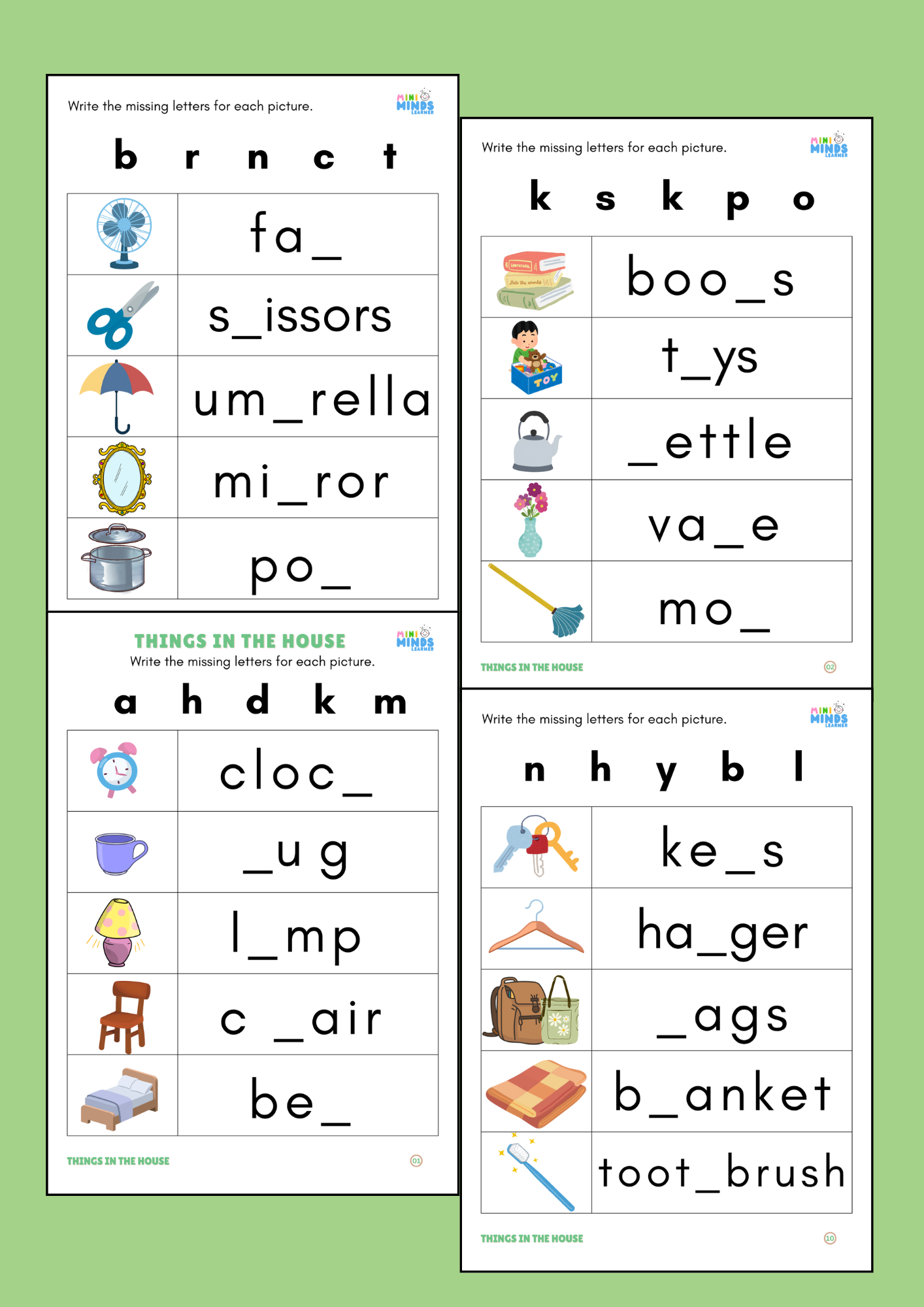 This fun and engaging worksheet helps preschoolers learn common household items while practicing letter recognition and early spelling skills.