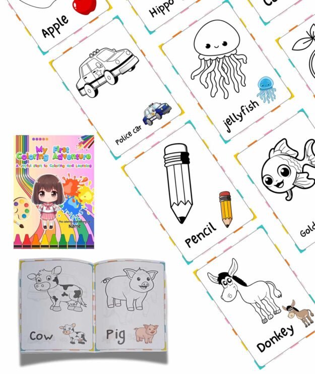 A fun and educational coloring book for kids featuring easy-to-recognize objects, animals, and everyday items with both coloring outlines and sample colored images. Perfect for early learning and creativity.