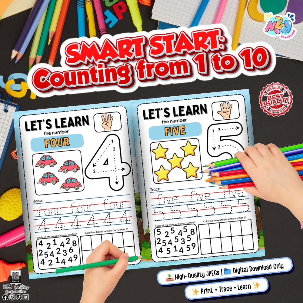 SMART START: Counting from 1 to 10 is a thoughtfully designed early learning resource to help toddlers and preschoolers grasp number concepts the smart way! Each activity sheet introduces numbers 1 to 10 using real-world, sensible visuals that make quantity meaningful and memorable.