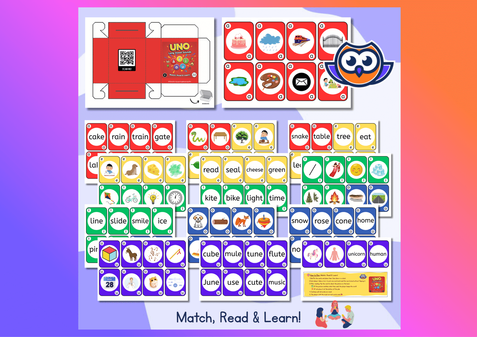 UNO Long Vowel Sounds: Match, Read & Learn! is an interactive reading game designed to strengthen children’s understanding of long vowel words such as cake, bike, rope, cube, and more.