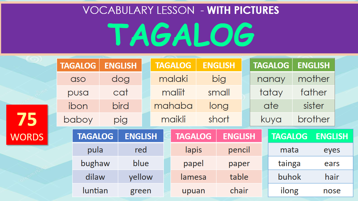 75 ESSENTIAL WORDS with English translations organized by categories: ๐ Animals (aso, pusa, ibon, baboy) ๐ Sizes (malaki, maliit, mahaba, maikli) ๐จโ๐ฉโ๐งโ๐ฆ Family (nanay, tatay, ate, kuya) ๐จ Colors (pula, bughaw, dilaw, luntian) โ๏ธ School Supplies (lapis, papel, lamesa, upuan) ๐๏ธ Body Parts (mata, tainga, buhok, ilong)